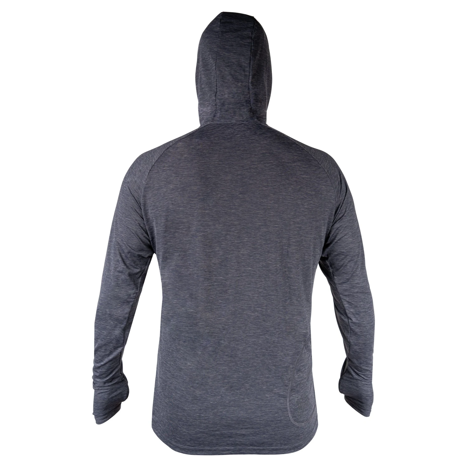 Breathable Heathered VentX 4-way stretch fabric ideal for wearing wet, dry, day, or night. Fast drying, moisture wicking, and ultra soft, this pullover hoodie delivers all-day-long comfort and sun protection, in and out of the water. Tested and UPF rated to block 94% of UVA/UVB radiation from the sun. Relaxed t-shirt fit; heathered look with a drawstring hood, featuring a large side zip pocket on the back right side and thumb holes.