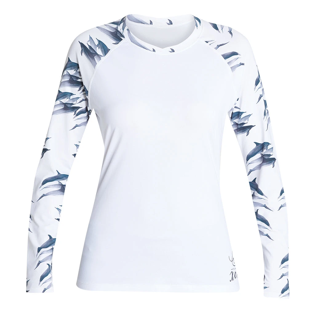 “The design of the dolphin print was inspired by a photo of a wild Hawaiian spinner dolphin pod taken by marine conservationist @JuanSharks of O’ahu. Extremely intelligent, playful beings, dolphins have strong social bonds, advanced sensory systems and use a larger percentage of their brains than humans do. They are also crucial to the earth’s food web. Unfortunately, in some areas of the world, these gentle creatures are being killed because they are seen as competition for food by fishermen, accidentally caught in longline fishing nets, or captured to perform for tourists in marine parks. You can help keep them wild and free by avoiding longline-caught seafood, single-use plastics, which are often ingested by dolphins and other marine life, and not supporting captivity for entertainment. By wearing these pieces you can be a reminder of the importance of these incredible animals to the health of our oceans. Mahalo (thank you) for helping us raise awareness.” – Ocean Ramsey