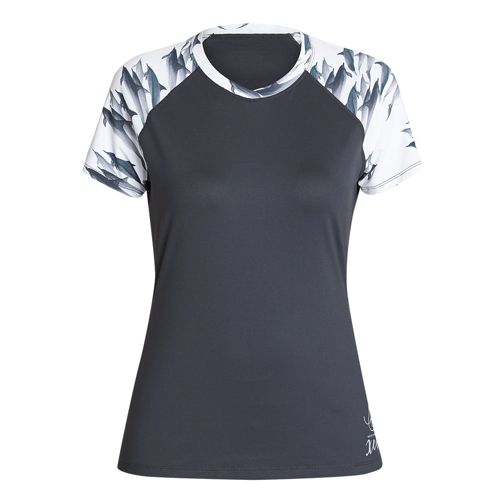 “The design of the dolphin print was inspired by a photo of a wild Hawaiian spinner dolphin pod taken by marine conservationist @JuanSharks of O’ahu. Extremely intelligent, playful beings, dolphins have strong social bonds, advanced sensory systems and use a larger percentage of their brains than humans do. They are also crucial to the earth’s food web. Unfortunately, in some areas of the world, these gentle creatures are being killed because they are seen as competition for food by fishermen, accidentally caught in longline fishing nets, or captured to perform for tourists in marine parks. You can help keep them wild and free by avoiding longline-caught seafood, single-use plastics, which are often ingested by dolphins and other marine life, and not supporting captivity for entertainment. By wearing these pieces you can be a reminder of the importance of these incredible animals to the health of our oceans. Mahalo (thank you) for helping us raise awareness.” – Ocean Ramsey